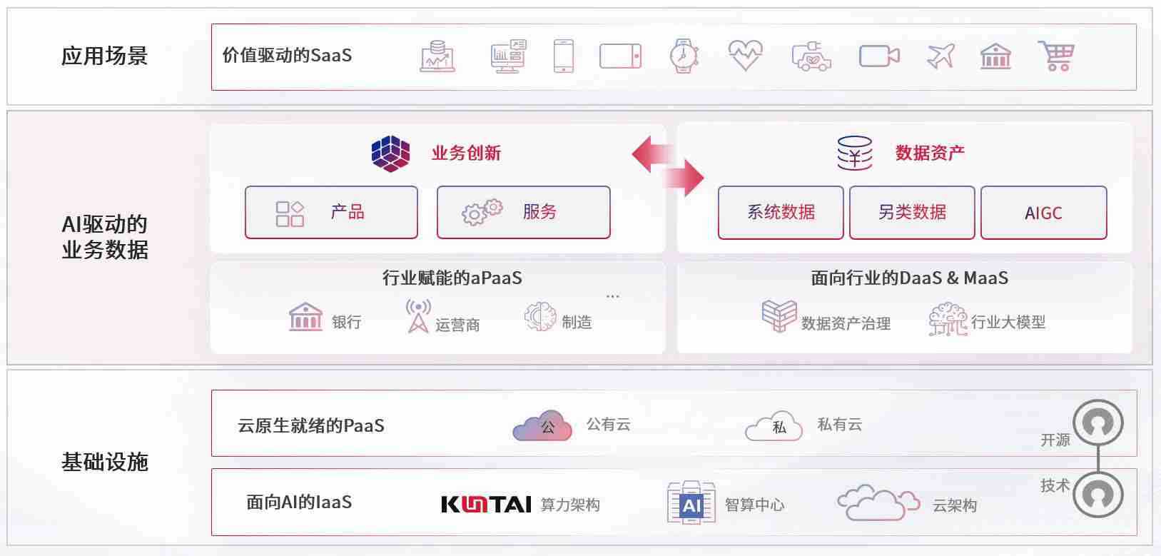 数字时代,,围绕企业数字化转型的关键要素,,,,9B娱乐数码开创性的提出数云融合战略和技术体系框架,,,着力在云原生、、、、数字原生、、、AI原生和信创产业上架构产品和服务能力,,,为处在不同数字化转型阶段的快消零售、、、、汽车、、金融、、、、医疗、、、政企、、教育、、运营商等行业客户提供泛在的敏捷IT能力和融合的数据驱动能力,,构建跨界融合创新的数字业务场景和新业务模式,,,助力企业级客户建立面向未来的核心能力和竞争优势,,,全面推动社会的数字化、、、智能化转型升级。。